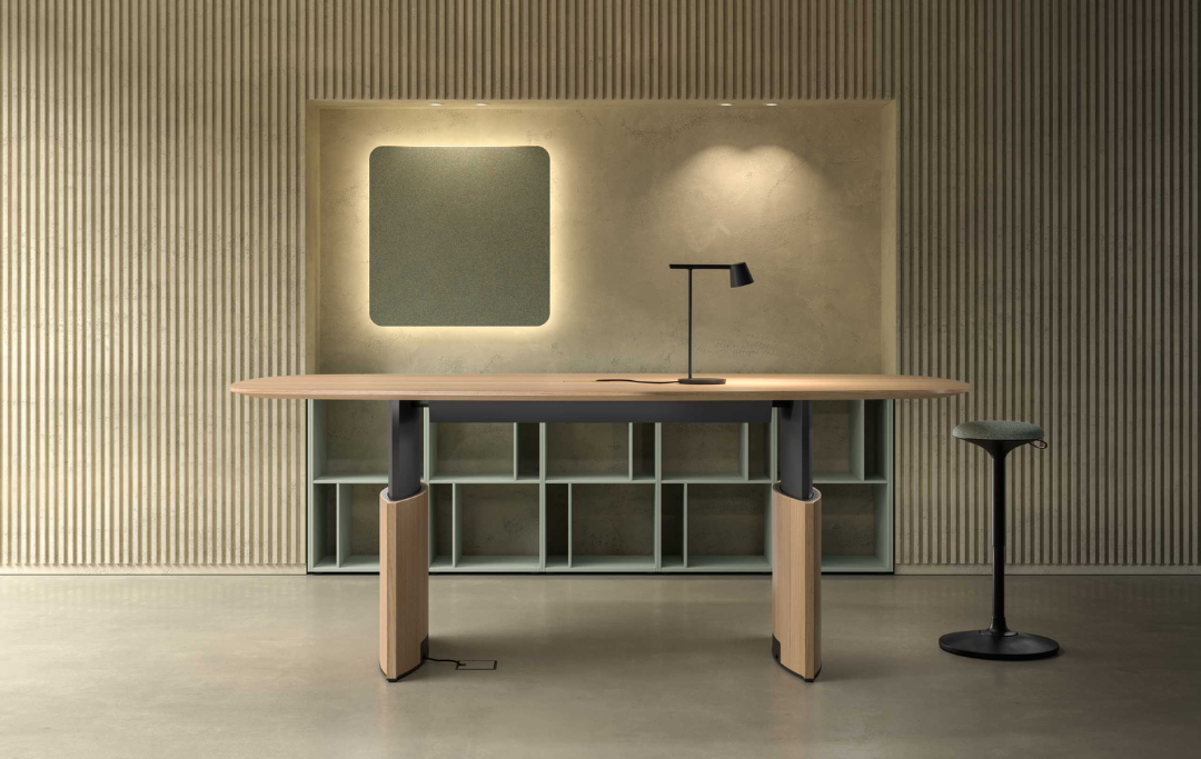 The Eleva Meeting Table by Bralco is a modern, height-adjustable table designed to combine elegance, flexibility, and ergonomic comfort in collaborative spaces. With its sleek wooden top, sturdy legs partially clad in wood, and integrated cable management, Eleva offers a refined look while supporting both standing and seated meetings. Its minimalist design and high-quality finishes make it perfect for contemporary offices, encouraging dynamic interaction and enhancing productivity in meeting areas.