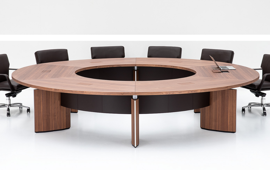 The Epico (Round) collection embodies the pinnacle of executive elegance and craftsmanship, offering round conference tables with tops enveloped in luxurious hard-leather and supported by bases in matching hard-leather, marble, or wood. Its design language is defined by graceful, arched surface profiles—often featuring a refined 45° edge detailing—that lend visual lightness while maintaining structural presence. Fully customizable in size, finishes, and technical features such as cable management and multimedia jacks, Epico (Round) delivers a harmonious fusion of comfort, prestige, and adaptability—perfectly tailored for sophisticated leadership environments.
