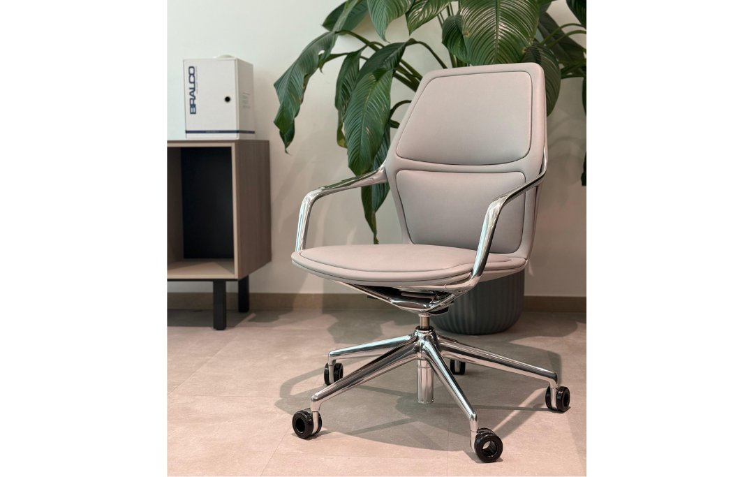 Top comfort for meetings of top importance. The ray conference swivel chair combines a lovely flowing design with ultimate comfort. This is the result of ergonomic zones with upholstery padding in a range of colours and materials for the chairs with a medium or high back. The swivel chair with a low back, meanwhile, has a complex design on the inside since there’s a plastic seat shell with comfy slats that adapt to the user’s body underneath the upholstery. And then there’s the innovative tilting mechanism. This is integrated in the cast joint between the attractive V-shaped seat support and the elegant four-foot base, ensuring radial-kinetic activation that has a positive impact on circulation and fitness levels. This conference swivel chair also has perfectly balanced lines. The seat shell, armrests and functional frame – with an optional return mechanism, continuous height adjustment depending on the model, and casters or gliders – look like they’ve been made from one piece. A choice of coating colours and metal finishes, like Brunner’s exclusive dark chrome, are the perfect finishing touch for the unique ray style.